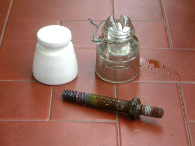 Today I completed the rescue from the roof of my office: a porcelain telephone insulator and a couple of 396-920 in pyrex glass (one of the two galss ones not in the picture 'cause still under HCL bath). I also saved one of the pins.