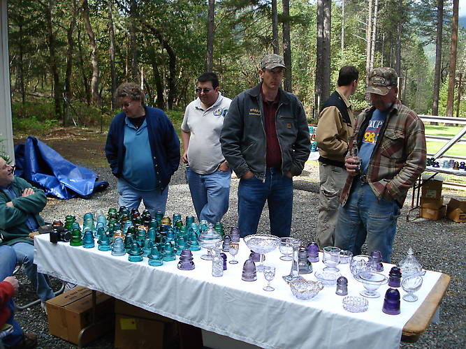 Here is another view of folks standing by Tim & JoAnne Woods table. Left to right... Janet Bond, Steve Dartnell, Ben Kirsten, Nathan Lamkey (looking away fro camera), and Mid Norris. Check out the cool "Early American Pattern Glass" (EAPG) that JoAnne brought to sell, nicely arranged with purple insulators. I've bought a few of these pieces from JoAnne in the past, mostly the "hobnail" style of small drinking glasses which appeal to me. This is a very cool collectible! |