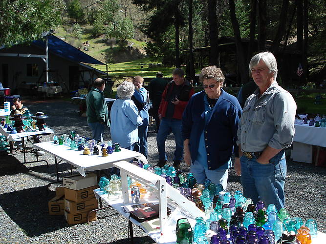 Here we see Janet Bond's (and Steve Dartnell's) sales table in the foreground. Janet and Carl Scott are admiring the glass. Janet brought some fantastic pieces to this swap, including a stunning array of purple Denver glass, and a deep purple CD 133 California, that just happened to find a new home with yours truly. Once again, notice the sylvan setting... forest, green grass, fresh air. Such a great place for a swap! |