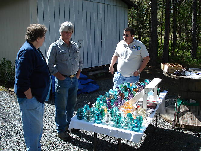 In addition to all the purple Denver glass, Janet also brought a great selection of tramps (hint: the tramps are on the table). That other tramp chatting with Janet is Carl Scott. To the right is Steve Dartnell, proudly sporting his JSIC and Golden State club patches. |