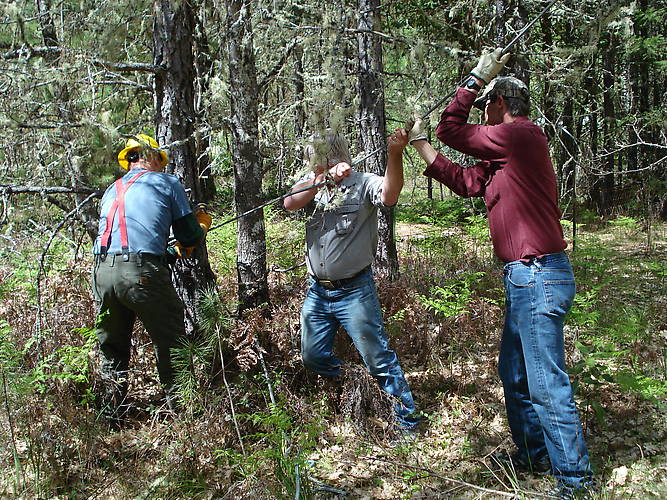 In preparation to fell the pine tree, Dave Kurns instructed a team of volunteers to position the rope that would later help guide the tree safely to the ground... exactly where Dave wanted to it to land.
