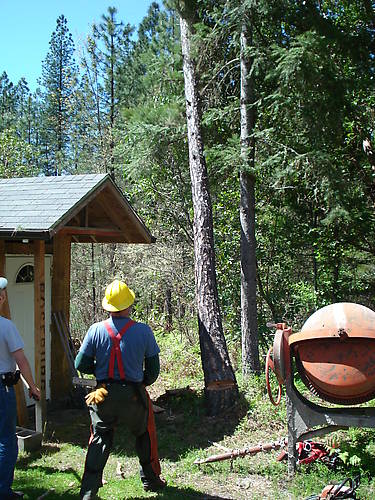 Dave Kurns steps back, as the tall pine begins to topple. Out of view, the holders of the rope are helping to guide the tree to its resting place.