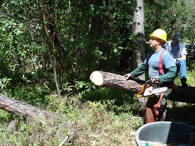 This tall spindly pine is rendered less formidable with Dave's chainsaw. Standing behind Dave is Dale Blakely, admiring Dave's good work.