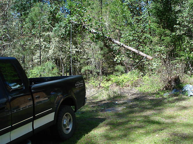 What's left of the pine tree gets yarded out of the neighboring tree-tops, courtesy of Randy Hale's pickup truck.