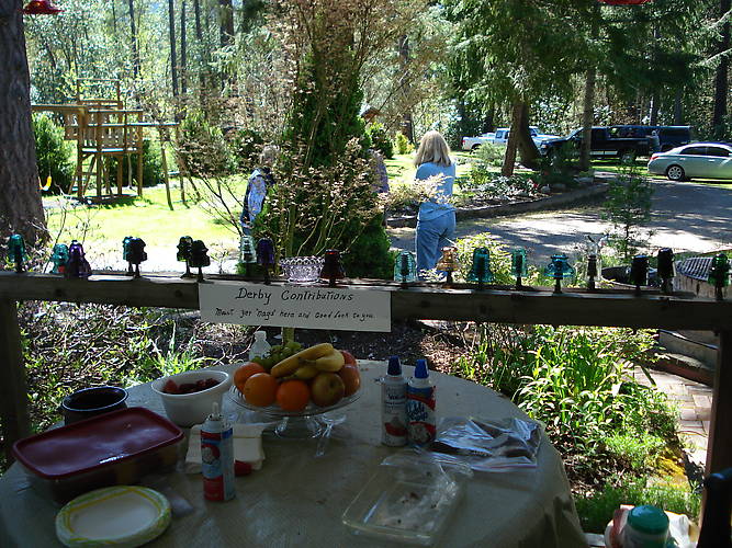 Each year, the Blakely's have hosted a Kentucky Derby insulator drawing. Everyone who wishes to enter the race donates an insulator, preferable worth $15 or more (some entries were closer to $75!). JoAnne Wood donated one of her beautiful pattern glass bowls. All participants drew names of horses in the race. Whoever draws the winning horse's name wins all the insulators! It's a fun way to spice up a swap. In this photo, we see the "pot" awaiting some lucky winner. Soon, everyone was gathered around the TV, waiting for the race to begin. |