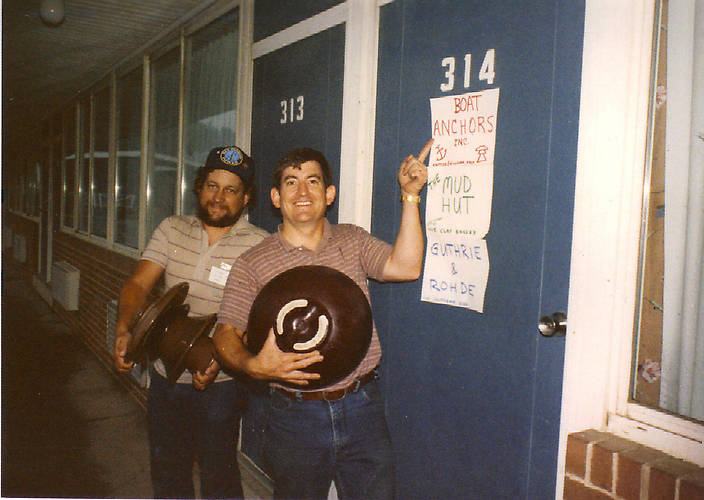 Based upon recent threads on ICON about National Shows, here are some snapshots of Allentown and our motel room full of insulators we had purchased on the Humongous Buying Expedition coast to coast that summer. See the whole story...Bill and Mike's Excellent Adventure at: http://cjow.com/archive/article.php?month=7&a=07Bill%20and%20Mikes%20Excellent%20Adventure.htm&year=1990 This pic is the entrance to our room, a.k.a. Boat Anchors Inc., a.k.a. The Mud Hut, Guthrie & Rohde Proprietors [id=279716185] |