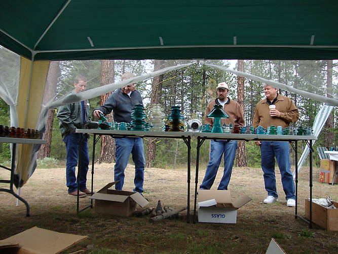 Showing that gravity affects his legs ten degrees off from normal, Justin Martin (in hat) stands with buyers at his table. L to R Dan Simmons, Howard Banks, and Dan Spanton.