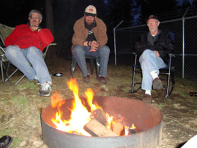 The GOM's boot (bottom left) would never pass the Sergeant's muster, but with empties laying about, this crowd is paying no attention. L to R: Shifty Yuhas, Justin Martin, and the King of ZigZag, Ernie Carlson.