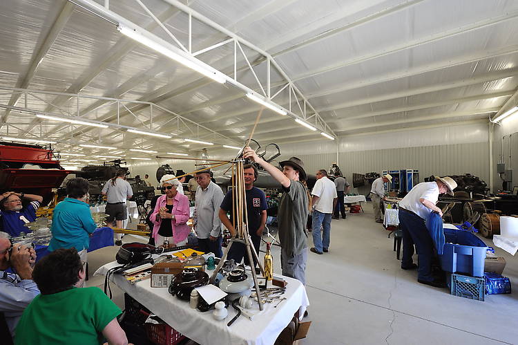Show host Tommy, on the left, is relaxing at his table with some large glass multiparts on display while Dan and Miles as messing about with some wooden structure. The blue icebox on the right supplied everyone with cold drinks for the day. By the end of the show the ice melted causing the cans to float around in water Notice all the military hardware in the background. |