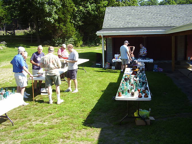 In terms of area, it wasn't much. But the show packed a punch and there were many great jewels in the rough. Mr. and Mrs. Phil Harding (the first president of the Yankee Pole Cat Insulator Club), are talking with Doug MacGillvary, John Rajpolt, L.A. Jones, and Peter Persoff. To the right, Dario DiMare catches up with Rick Weisman and Jill Meier. In the foreground is my table and small display. I showed my M-3890A and some finds from the Hartford Faience Co. factory site as well as the club's photo albums dating back to the late 1960s. |