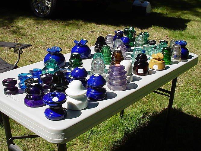 A table full of insulators for sale. Thanks to Bill Ostrander I got a lighter purple spool for the collection.