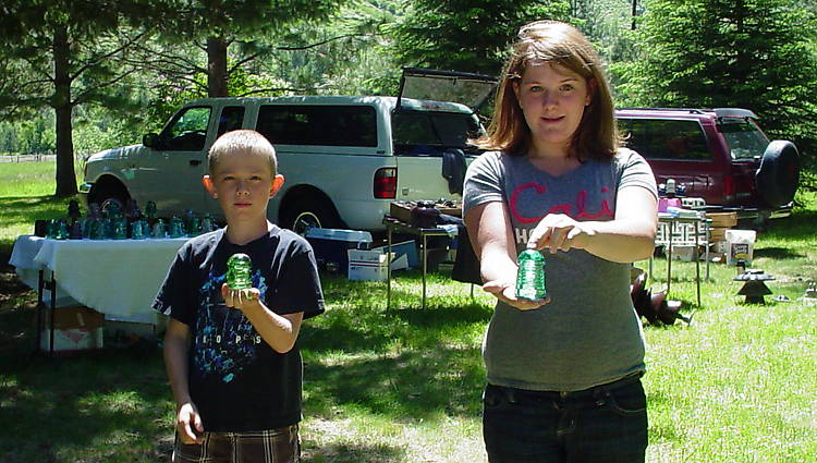 This is what it's all about, new collectors. Taylor Lane (10) and Treynae Lane (12) from Elgin Oregon, showing off a couple free insulators from my table. The grandparents last name is McLaughlin. See Crown Jewels next month for Taylor in action. Enjoy the Swap Meet pictures; and support the Shows BIG or small. If anyone has 5 or 6 good {thicker sized} side pins bring them to Dave Moffatt's Show July 23, 24 in Ellensburg, WA. |