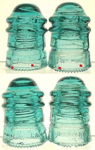 Pair of stamp embossed No 12's from the same mould found in different places. Both have the I & N and the A & Y in Hemingray joined together as one and on the rear skirt base,2 mould repair blots/dots, 1 below the O in No and one to the right of it about an inch. Both dots are in the exact same spot and I have hilighted them in red. Insulator on the right has 5 drips flush removed and 6 drips partially flaked and halved and a tiny micro flakelet plus several dometop pin pricks.LH insulator has 3 drip halved,3 drips halved with a small crack(NGM) and several drip tips nipped. On the WG there's 1 tiny micro flakelet and a few dometop pin pricks. The pair for $7.50 + shipping. |