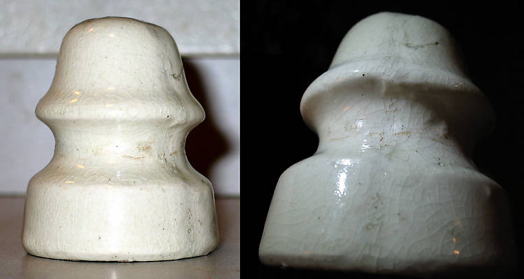I had to get Elton to ID this one for me, he says it's a Pittsburg U-240 that the, "glaze did not fit, it shrunk more than the porcelain when it cooled." I've pictured two views of the same piece to show the crackled glaze all over it, and the other a straight on profile. Thank you Elton for your continued dedication to the hobby in helping us identify our finds. |