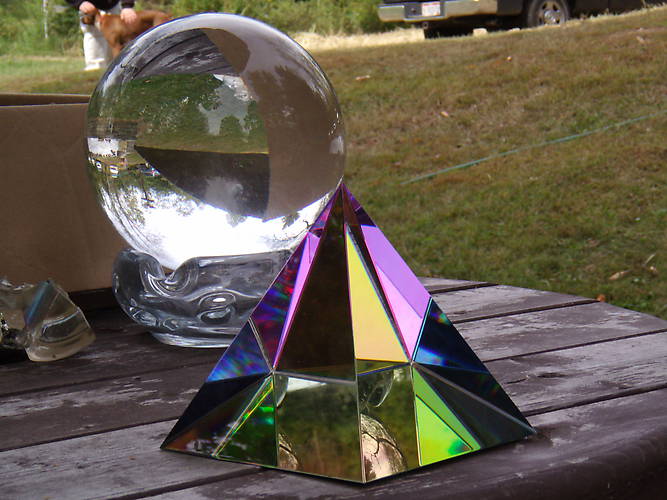 Mike Donnelly whose property the show is held, brought his prism and sphere glass in the sun. The prism breaks the light into rainbow colors. When looking into the sphere the view is upside down and reversed. Mike has learned not to hold in his hands while the sun is out. The light is magnified so intense as to burn his hand. Very cool glass to have! |