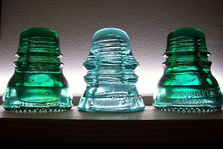 Out for on a " Hunt " last weekend and found these three Brookfields on one rail of a two rail pole. First from the left is a dark green with lots of amber CD 152 ( SDP ). Center one is a light blue CD 151 which has a streak of milk that starts at the dome and ends up down to the skirt with a thinner streak of amber in the center of the milk streak. On the far right is another CD 152 that is a dark green and amber mix (SDP ) |
