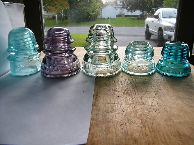 Hre are the insulators I found yesterday at a flea market I visit on a regular bases. Purchased the Brookfield B&O, the two 190's and the McLuaghlin 154 from the same guy I've done business with in the past. The Hemingay-50 has the No 50 blot out on the rear skirt. I'm going to post a close up pic of the terible blot out job. The N and the 5 are obviously there. Anyway, I had to bring my price guide to prove to the man that what he had wasn't worth a small furtune. He told me he had the 190's the last time I asked him if he had anymore insulators. Then he discribed them at not having a top and as a Hemingray 50. He like myself long ago didn't know insulators were made in two pieces and called 1. Myself I still wonder why there is a seperated CD# for a top and for the bottom of the respective two piece combination. If I'm ever asked to ask a question or make a contribution again at the forum maybe I'll ask why then. That's if I remember. If anyone is interested in any of these insulators I'm auctioning them off at Febay starting tomorrow night. Advance search RogerP518 and you'll see these more in detail along with other nice insulators. Thanks. |