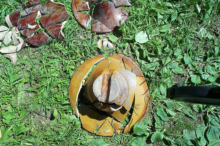 It pays to recheck areas you hunted befor.... The next three photos are of a 95% complete origional cement Thomas M-3890 that was found in part three years ago by Paul Greaves, Carver Mead, and myself .( [id=259458094] to see a complete restored one) We did not find enough of any of the skirts to this insulator at the time to deem any worth saving. Fast forward three years and I decided to go and re-dig the site again and look for the missing parts . Well ...scattered out from where we found the original stuff I found the large missing part of the crown and top with parts of the center and base skirts still cemented in ! BINGO!!! It is now a restorable Thomas M-3890 with original cement! Very few 3890's that I reconstructed were composed of all three skirts from the same original insulator . This is one of only three Thomases that fit this description. It really pays to recheck dig sites sometimes and also to NOT take parts of insulators that could perhaps later be found. BTW...This is what nearly all the 3890's now in collector hands looked like when they were first found in the wild .It will take several days of work to turn this jigsaw puzzle into an insulator again! See the next three photos for more pictures of the other skirts. |