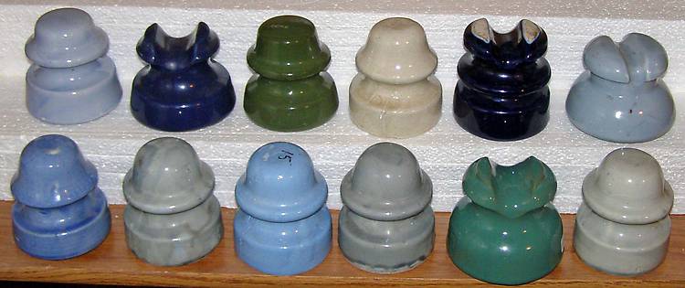 Colored porcelain as follows (Left to right) -- actual postage added: Top row: -- Nice blue unmarked signal -- JD color! - no issues -- $10 -- Dark blue cable marked KNOX - No issues -- $12 -- green signal marked LOCKE - small inner skirt chip - $12 (SOLD) -- Very unusual colored signal - unmarked -- factory nibble on the inner skirt -- $8.00 (SOLD) -- Cobalt blue hi-top - marked V in a rectangle -- couple tiny bb dings at base -- $25 -- Blue Canadian cable - marked HESCHO -- $8.00 (SOLD) Second row: -- Great colored blue signal - unmarked - rubbed spot on the dome -- $8 -- gray mottled signal - unmarked -- $8,00 (sold) -- bright blue signal - unmarked -- small base flake and inner skirt chip -- $10 (SOLD) (sold) -- nice mottled darker gray signal - base defect (looks like factory) -- $8.00 -- Nice Turquoise green cable marked OB no issues - $18 (sold) -- another mottled gray signal - no issues -- $8 |
