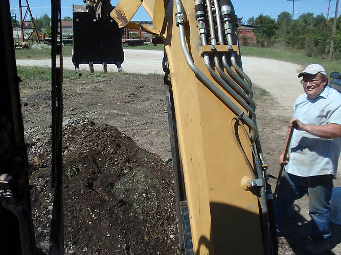 Roger waiting for me to swing the bucket out of the way so he can go thru it