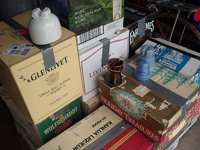 I paused for a few moments after unloading the porcelain collection out of the car. Spotted a few neat ones, so I set them on the box pile. The U-186 Purkey Patent is a sweet one! I will be keeping some of these boxes taped shut, so I will have time to open them up one at a time! Lots of color in this collection-yellow/yellowish, and blues galore. Also 20-30 glass pin types thrown in. |