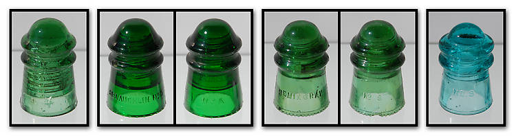 You may want to view the original of this to get a better look. 1. Green star. A few small pecks and fleabites as well as a small shallow flakelet on the wire ridge in front. $9 plus shipping. 2. Emerald or 7-Up McLaughlin. Open bubble on wire ridge as seen in picture and a bird peck on the shoulder. $9 plus shipping. 3. Hemingray in green with some faint amber wisps in the skirt. V-shaped rear skirt chip that takes out two drips. Two other drips flaked on the inside. Couple of fleabites. Because of the chip, way below book at $19 plus shipping. 4. No Name in blue. A fleabite or two from mint. I have about a dozen of these all in the same condition. Take as many as you like at $5 each plus shipping. |