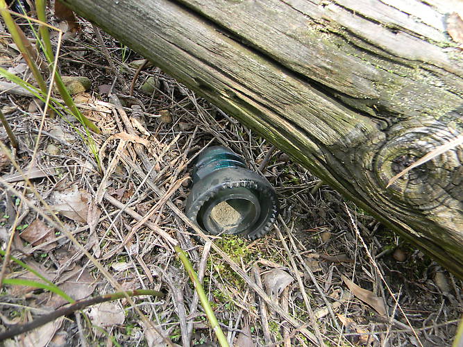 One pole in the chain of poles along the tracks rotted out on the bottom and fell over. All around the base of the pole was Aqua CD 154, CD 152, and some Clear CD 154s. Here is the CD 152 before I picked it up. In the upper Left corner of the picture is the base of a Aqua CD 154. |