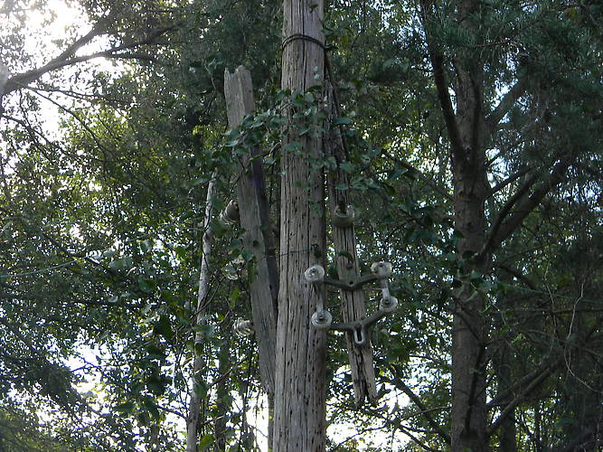 This poles crossar snapped in half. The reason it did is that the pole next to it is being held up by 3 Copper wires. It is being held up in midair and the stress broke this poles crossarm and insulators!