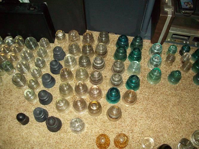 I picked up a collection from a very nice lady down in S. Florida today. It was about a four hour drive round trip, but it went smooth. I traded a bunch of old lamps and a couple typewriters for all of these. There were 176 insulators in total. This picture shows more commons. Towards the bottom is a pair of stained and crackled Hemi/Lowex's with a ring glued to the top for a candle holder I guess? Also, some plastic insulators. |