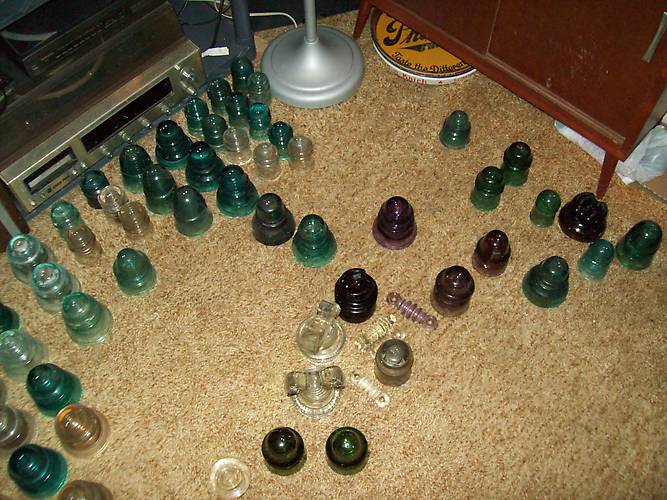 I picked up a collection from a very nice lady down in S. Florida today. It was about a four hour drive round trip, but it went smooth. I traded a bunch of old lamps and a couple typewriters for all of these. There were 176 insulators in total. This picture shows some of the better ones including a couple of purple cali's, green stars, a purple strain, and some others. I will be adding more pictures from this collection to the Help/Questions and other folders. |