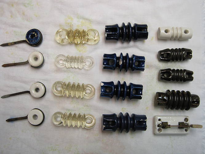 I found these today at a local antique place all strung on a wire. Some of the better one's are a blue Birnbach spool, a white Findlay 1926 spool, a straw Fleron, a clear spiral type, Four large blue Fedco's, a large brown Sen.sory Heco 3017 and a neat white circuit breaker switch with Woodwin 25A 125V on it. e-mail me if anyone has a question on these. |