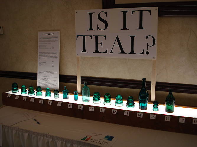 Here is a grouping of teal bottles and insulators that were loaned by show attendees as examples of "teal." Unfortunately, there were not many participants in this display, so the showing was a very "thin" representation of teal. Even though there was a ledger and ballots to rate each item, hardly anyone participated. Only three comments were offered, and each one favored the bottles... basically saying the insulators in the display were not teal at all, but rather dark shades of green, blue, or aqua. Frankly, I must agree. With the exception of the midnight blue diamond pony furnished by Mid Norris, my own personal opinion is that all the other insulators had "teal influences" at best (this includes my own CD 133 Brookfield). When placed alongside some of the intense teal bottles, most of the insulators just lost their pizzazz. My lousy point and shoot camera skills did not help either. That said, I hope to setup this display at a very large insulator show in the future... where much more interest can be generated, with an exclusive focus on insulators. I believe it would be very revealing to line up some of the best teal threadless, diamond ponies, Mexican glass, etc... I know there are some "drop-dead" teal pieces in this hobby. Perhaps at the San Jose National next year? We'll see! |