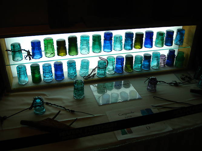 Here is the first of several photos showing Paul Puttkammer's outstanding EC&M display. Again, I apologize for my poor photography skills. I don't know how to adjust for the heavy blue influences of the florescent back-lighting. Still, I hope these photos convey some idea of the quality of Paul's collection (which won the Jefferson State Insulator Club Choice Award). |