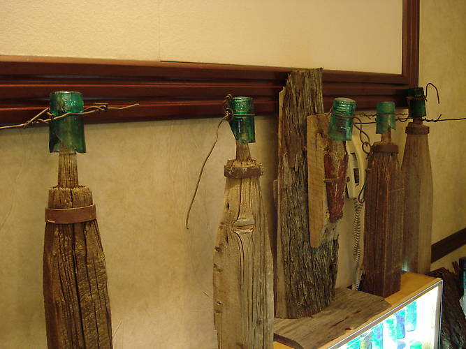 Yet more EC&M hardware. Note the cool wood block with red-painted side-pin, a very typical EC&M tree installation, just as Paul found it. Also some great iron pole-top rings. Note... the plastic telephone in the photo comes from a more "recent" era in telecommunication history :-) |