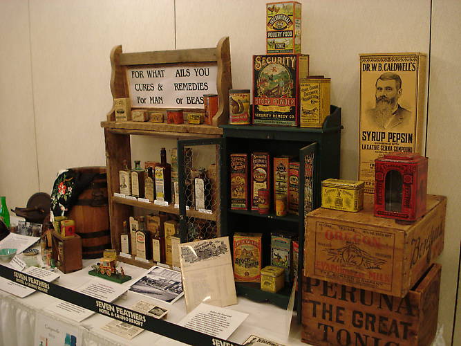 Here is Medina Russell's fine display of patent medicines. Judging by the illustration on the box, Syrup Pepsin resulted in vigorous growth of facial hair.