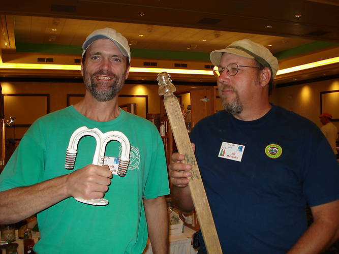 Here is Bill Ostrander (on right) holding his recently acquired Surge insulator pin, with yours truly on the left with my recently acquired metal bracket.