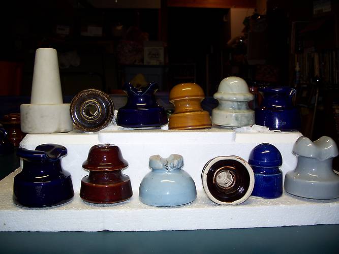 Top shelf left is one of a kind bushing- I paid 15.00 for it- so can you. Second in is a WILD mottled black glaze spool- Real Nice- GREAT character piece- 10.00 Third from ledt- Great deep cobalt- Real nice- 10.00 Next is Lapp marked K64 in black ink UG on dome- 4.00- SOLD Wild grey Green drippy glaze- Odd U style really diff in this style- Cost me 20.00- will sell for that.- SOLD Far right- LM 1963 stamp embossed, bright cobalt- 12.00 ---------------------------------- Bottom Far Left- sand blasted 1969 ME logo- Wild- 12.00 Next- Paper Thin Hartford A105 Almost Reddish- tough with thin ridge- 4.00- SOLD SUPER crude blue Pittsburgh cable 1880s vintage- 12.00- SOLD Truly two side real square base- Super crude Pittsburgh- 5.00 Great Bright cobalt Pony Square D on dome (Better than usual)- 6.00 Darker grey CP embossed on right- 6.00- SOLD |
