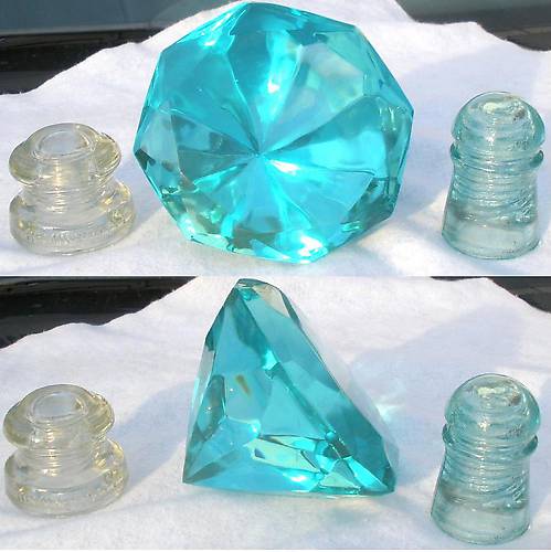 Today while watching my 4 year old daughter, we went to 4 shops in neighboring towns and found a few goodies to bring home. Mint CD 137 Hemingray puck, an other patent CD 102 crown embossed Christian cross with dates, and this huge, hand faceted, brilliant cut aqua glass "gemstone".No facet plane is alike and all were hand done. The gem was a measly $12.I have seen the small ones at gem shows for $45 and more so my buy price was a no brainer. I got the 2 insulators for $9. |