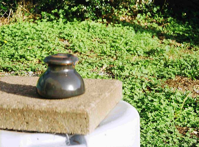 One of the Thomas Cable top insulators I kept from the 280 free ones. It looks dark brown with a weird blue cast out in the sunlight. When I take it inside, it looks pitch black! I think it's a U-629D but not positive, even with the guidebook!