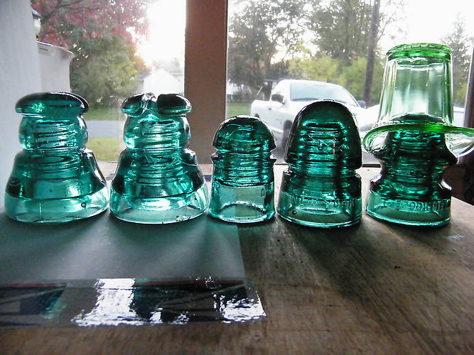 I know the two insulators on the right are 201 Postal's but what is the one all the way to the right. It looks somewhat like a 162.1 but I think it is a 164. Maybe it is just wearing the hat to cover up the nice milky dome it has underneath. I purchased all these insulators last weekend along with the depression green hat. The 210's came from the same place I purchased the one that had the Amber waterfall about a month or so ago. They sudden appeared after my last buy. When I get around to it I'm going to ask the owner of the flea market to have the past owner of these two bring all their insulators in. I purchased the 102 and 164 at a different antique store up in the Catskills. They also had not been in the shop when I last visited. I also purchased a nice little porcelian along with the other two that isn't pictured. I will be posting a pic in the questions ask file for an ID. Anyone knowing it's U# please email me. Thanks. I've also listed this batch at the E-Place if anyone is interested or just wants a closer look. Advance search RogerP518. |