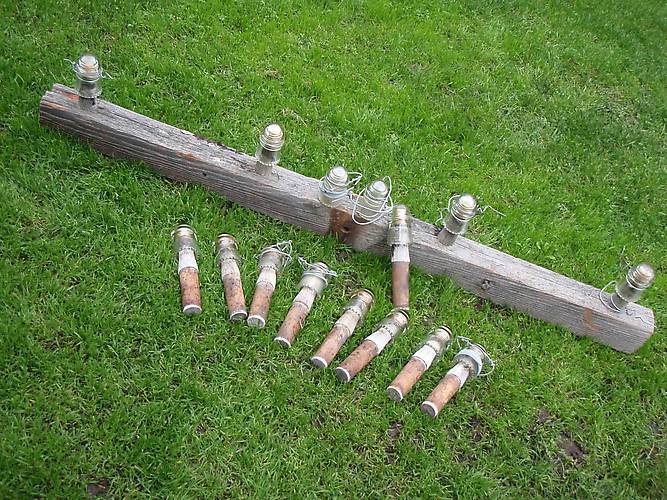 Got these off a guy who found them on Hunker Creek (7 KM South of Dawson City, Yukon). They were near a power plant that supplied power to the massive dredges that scoured the creek beds for gold in the early part of the 1900's. I'm assuming they were part of a communication network, since they are 108, Dominion - 9's (090) in a light sage green. Note how thick the pins are and the galvanized wire. Not horribly exciting glass, but a neat bite of history. |