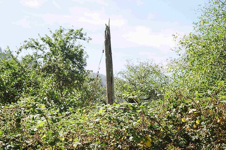 A closer shot of the "pole" . I would like to see if any insulators are under it, but not with all those Blackberry vines there! I'd hate to chop all those down just to find a couple of broken clear 42's.