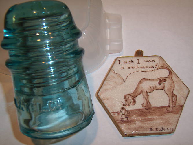 Met with Don at Springfield showing him this AM Tel with the period under the o. Punctuation differences do not matter so asking if the toll specialists know of this one? The tile came from a 70's collection signed by DD Jones. The back has an address label of Mrs. Clarence Jones, Texoma Estates, Pottsboro TX 75076. Does anyone know who these folks are? The tile has a leather hanger. |