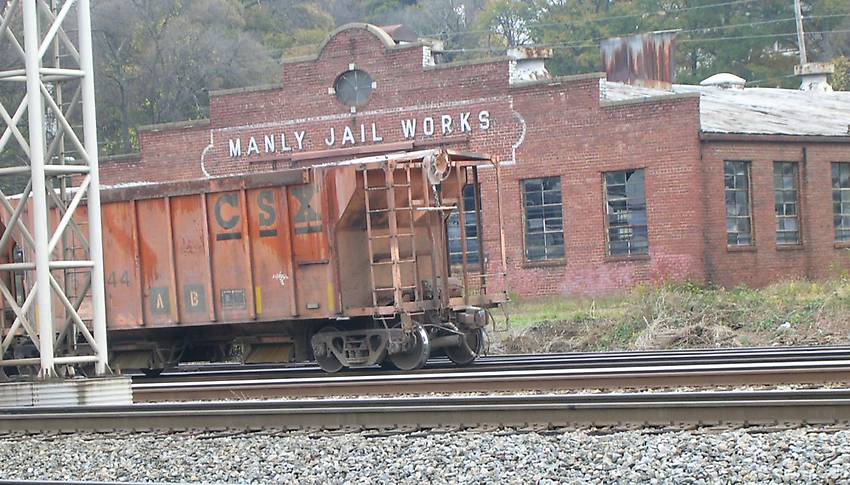This dilapidated, abandoned, and somewhat cryptically named factory building was across the tracks from the Dalton Freight Depot. I figured perhape they produced jail doors and "bars", but the real product can be seen in my next photo. There was along string of CSX coal hopper cars parked directly in front, so I could not get a clean photo of the entire front. This factory was active in the 1800s. |