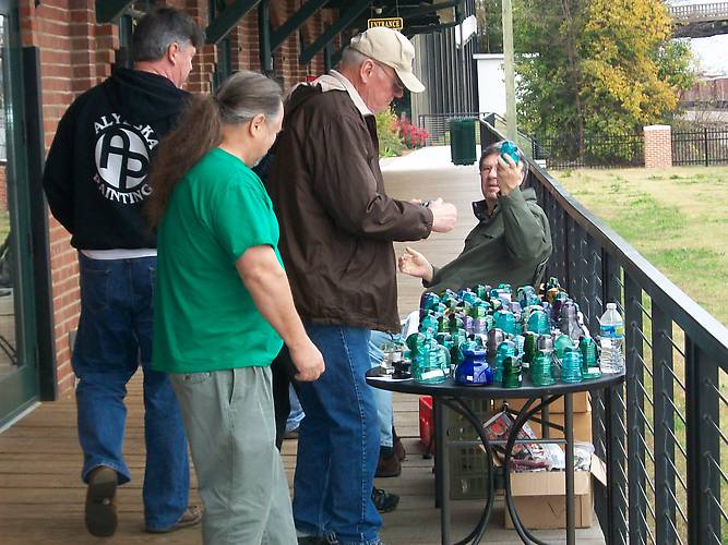 Keith Roloson had a nice selection of glass for sale. Here he is checking out a Chicago Diamond Groove while Dave Justice and Billy Ewing check out other items for sale.
