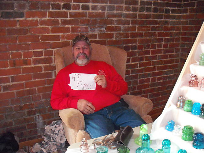 Steve Blair made the road trip down to Dalton, GA for the Dixie Jewels quarterly insulator swap. He brought his now famous "Hi Tim & Glenn" sign. Steve brought odds and ends and commemoratives to sell. I did my part in buying a bunch of 'goodies'! It was good to gab with Steve outside of the hectic Mid Ohio show. |