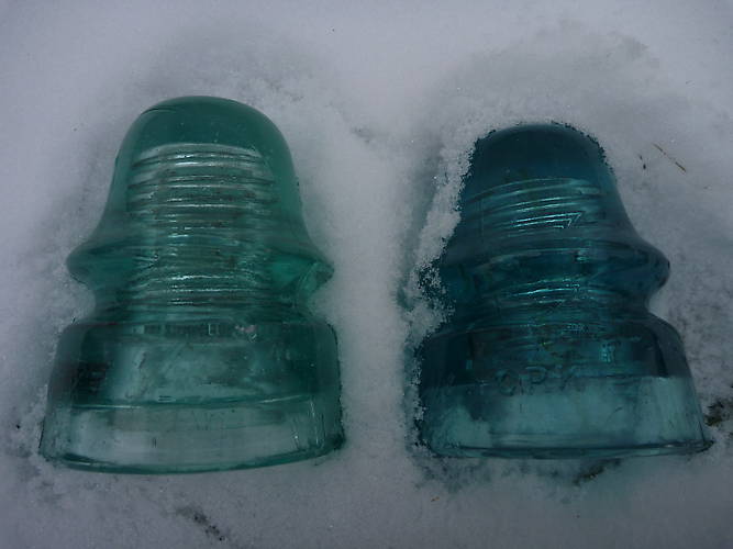 Here is a direct comparison between a standard aqua 162.3 and a suspected sapphire blue 162.3. These are not listed in the price guide, but holding them side by side you can see the difference pretty easily. This photo is not the best, but we haven't had a sunny day here in western PA for quite awhile (not that I'm complaining... love the snow!). Aqua on left, sapphire on right. |