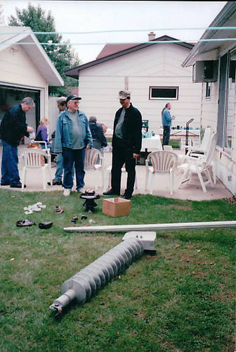Taken years ago at a meet held at the Harders' place. Wayne Duzynski and Dave French swapping tall tales while Gary Kline shows an insulators to Mike Harders (behind Wayne). Shawn Pritzl is in the far background to the right. When the Harders (Mike and his son Craig) had a "fire sale" dispersal of their collection some years later, Riley Armstrong ended up lugging that monster rubber chicken (in the foreground) home. Surprised he fit it into his [id=276905668;PT cruiser]! |