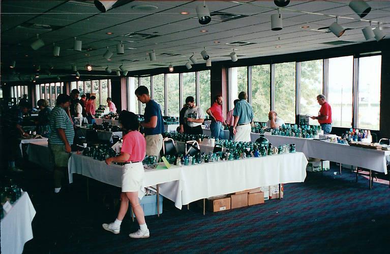 Kevin Lawless and Doug MacGillivary at their sales tables; Steve Marks and Joe Beres (and looks like Jack Risselman too) are discussing something with Kevin; Jeff Katchko is looking at an insulator on a nearby table. Ken Willick and Dick Bowman can be seen towards the left side. |