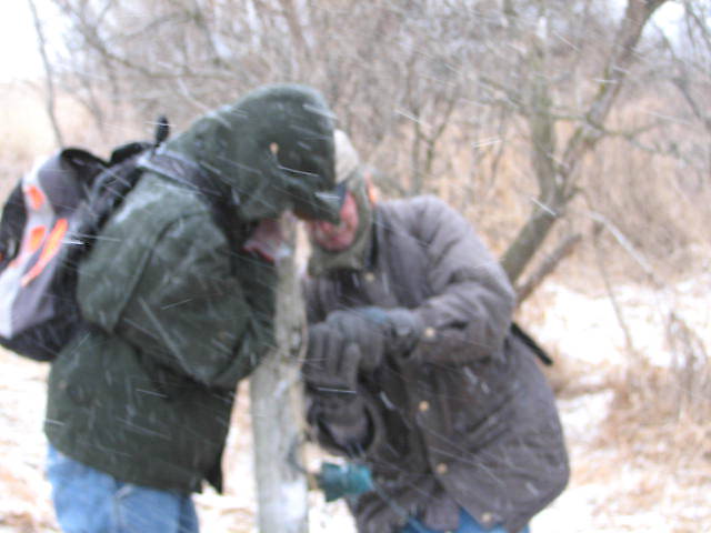 The sun was disappearing as the wind was begining to pick up. And it was starting to snow. This fallen crossarm had a nice yellow green Star beehive.